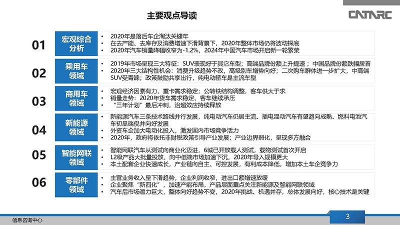 智能网联汽车产品投放将呈现以下趋势: L2级别产品导入速度将更快,规模更大,自主品牌市场投放将进一步下探,合资品牌继续在15万元以上市场加快布局; L3级别产品投放将在2020年开启,自主品牌有望领先投放;2020年,企业在智能座舱产品的竞争将扩大;